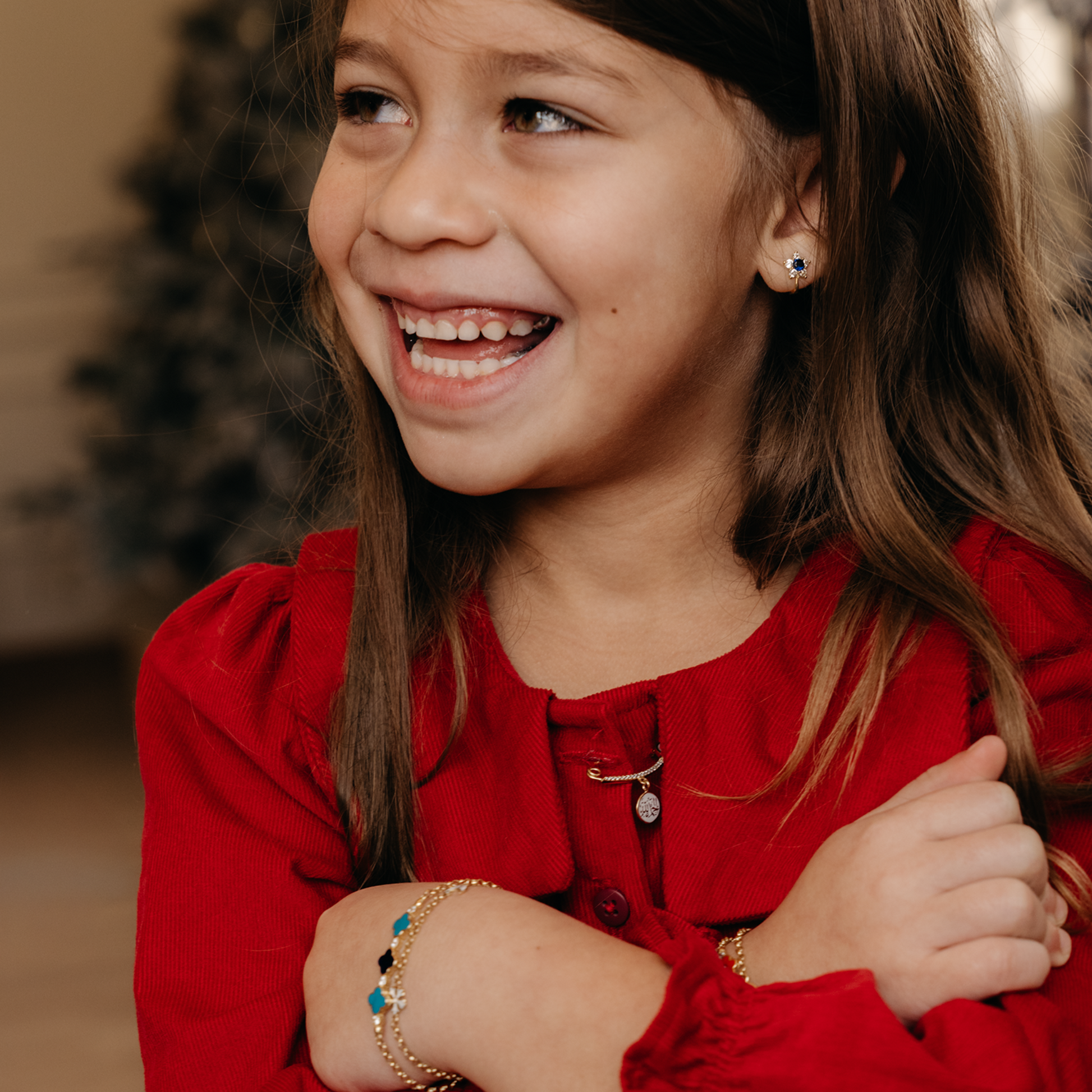 Store Properly: When your kid is not wearing the jewelry, store it in a soft pouch, a jewelry box, or a lined compartment to protect it from scratches. Keep each piece separate to avoid friction with other jewelry, which can cause damage to both the gold and the enamel.