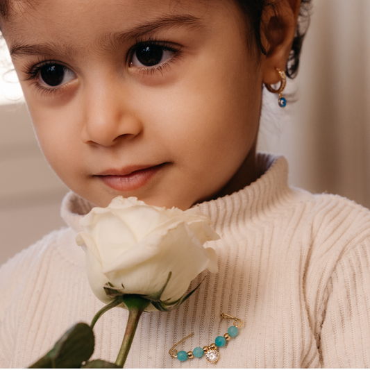 The polished gold finish gives a gentle, radiant touch, while the playful designs, including tiny animals, protective symbols like the evil eye and Hamsa, and sweet motifs, add a meaningful element to every outfit.